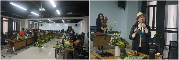 活动现场,特邀日本华道草月流的花道师徐珍为大家讲授花艺,详细讲解了插花花材的识别、色彩的搭配、插花特点等方面的知识,并现场进行了插花展示,指导大家亲自实践插花。