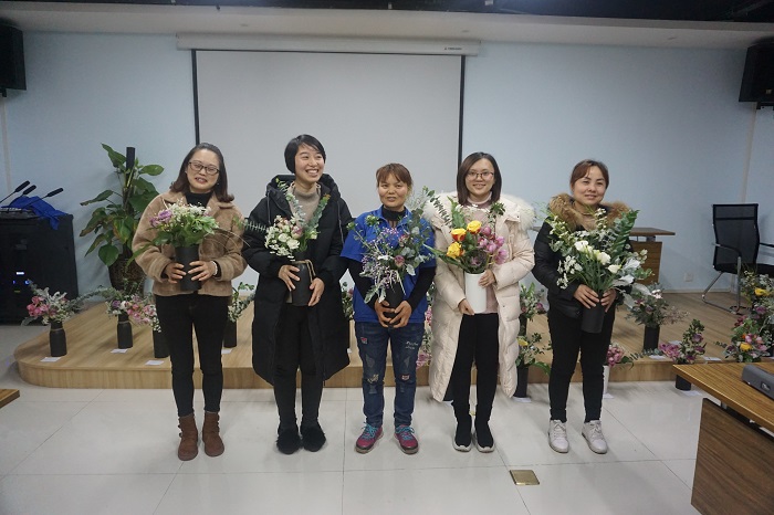 经过2个小时的培训和亲手实践,在老师的精心指点下,一束束错落有致、生机盎然的插花作品展现在了大家眼前,看着通过自己双手制作成的插花作品,大家的脸上都洋溢着喜悦的笑容,纷纷用手机记录下这精彩瞬间。活动最后,在徐珍老师和各位女同胞的评选下,出现了华数本年度五位“最佳花艺设计师”!