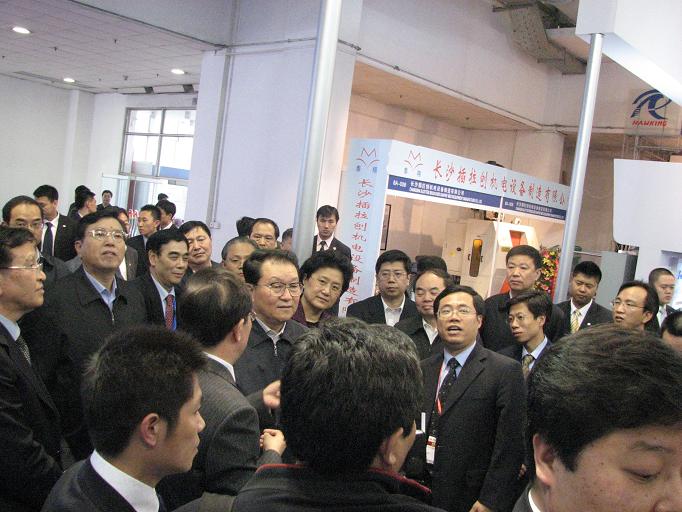 4月23日下午五点,中央政治局常委李长春、国务院副总理张德江专程参观了华中数控展台,陪同参观中央领导还有国务委员刘延东、教育部部长周济、工业和信息化部部长李毅中、国家发改委副主任张国宝等。华中数控董事长陈吉红向中央领导汇报了全国产化五轴联动高档机床展出情况,周济部长对华中数控展品进行了精彩点评。李长春同志与陈吉红董事长亲切握手,鼓励华中数控继续努力,争取在全国产化五轴联动高档数控机床批量生产应用方面取得更大突破。