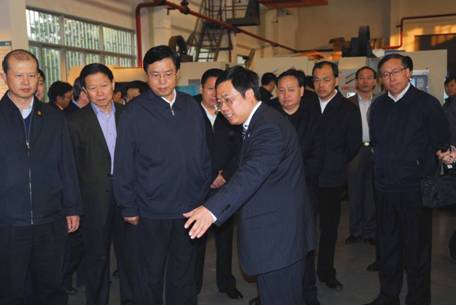 在华中数控机电联调车间,张德江副总理参观了配置华中五轴联动系统机床加工和专用数控系统单元展示。在车间现场,张德江副总理仔细观看了五轴数控机床正在进行的五轴加工,针对高精度模具加工需求研制的HNC-08模具加工数控系统,六轴联动机器人,100KW大功率交流伺服驱动和伺服电机,大型水轮机叶片加工智能化修正技术,红外热像仪技术,特种伺服技术,最高移动速度可以达到60m/min的双轴同步驱动技术等。在各类专用数控系统单元展示面板墙前,张德江副总理驻足良久,详细听取了华中科技大学积极与广东、浙江、湖北等省企业,加强产学研合作,融入区域科技创新体系,扎根当地,为区域工业经济发展源源不断地提供技术支撑,表示高度评价。