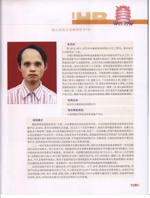 为了深入实施人才强省战略,引导高层次创新创业人才投身湖北经济建设主战场,促进湖北科教人才优势转化为经济发展优势,省人事厅自2008年起在全省实施“湖北省自主创新岗位计划”和“湖北省博士后科研流动岗位计划”。全省60多家企业申报自主创新岗位75个,经过组织院士、专家审评,确定了10个“湖北省自主创新岗位”。武汉华中数控股份有限公司总工程师朱志红,荣获“湖北省自主创新岗位”人选,岗位研发项目为“中高档数控系统及制造装备产业化”。