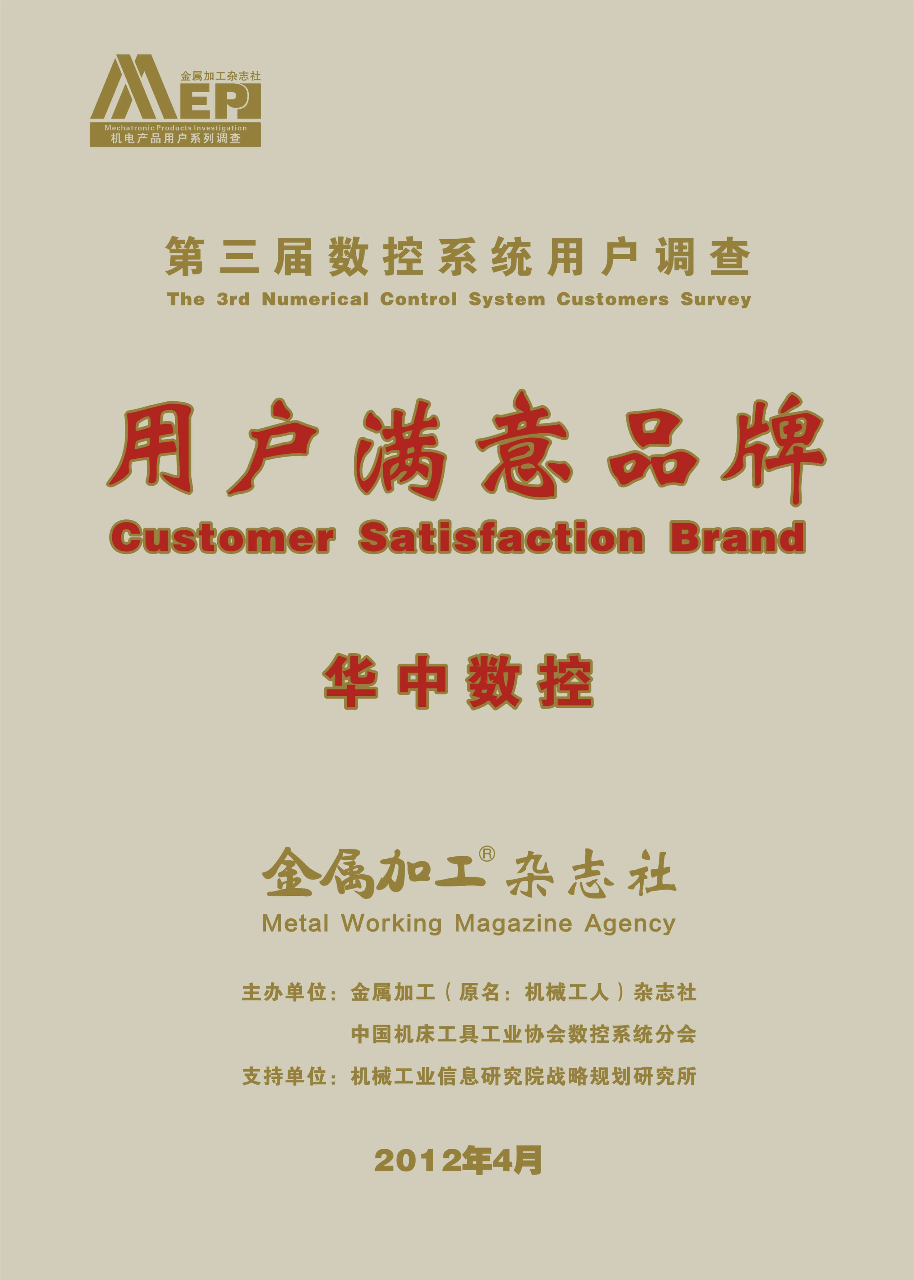 2012年4月16日在南京CCMT2012期间,由中国机床工具工业协会数控系统分会与《由金属加工》杂志社联合主办的“第三届数控系统用户调查”正式发布,华中数控与国内外知名数控厂商一同获得了用户满意品牌奖,这一奖项的获得是对华中数控多年来为中国数控系统发展所作贡献的高度肯定。