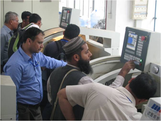为了达到培训目标,公司对教学计划、教材、教具和师资进行了认真研究和周密准备。抽调了8名具有丰富教学和实践经验的数控专家担任任课教师,其中正教授3名、副教授1名、高工4名。并全程配备了7名具有数控技术背景的英语翻译,上课采用英文课件及中英文同步翻译。为了加强学员的理解能力和动手能力,公司在多媒体教室里专门布置了10台数控教学综合实验台,老师在讲课中随时可以进行实物演示,学生也可以动手操作。此外,还安排了教学实践课程,包括参观了华中科技大学工程训练中心、武汉职业技术学院、湖北三环方向机有限公司等院校和企业,同时,在公司实训基地进行数控车床、铣床操作、编程和数控系统调试等,以达到学以致用、融会贯通的目的。