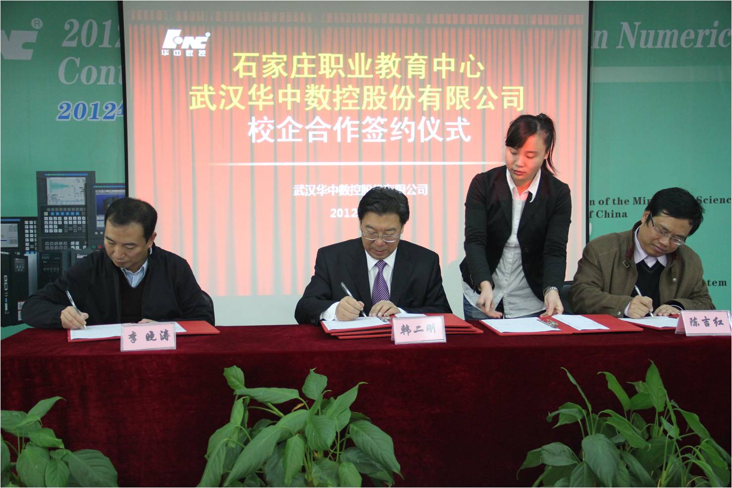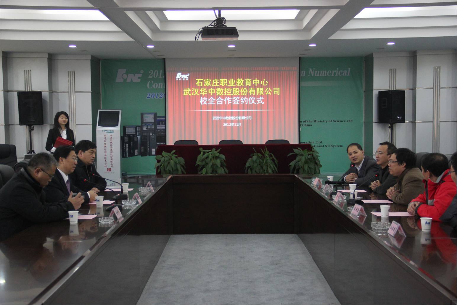 2012年11月23日上午,石家庄市职业教育中心与武汉华中数控股份有限公司校企合作签约仪式在华中数控会议室隆重举行。石家庄职业教育中心校长韩二刚、武汉华中数控股份有限公司董事长陈吉红、总裁李晓涛、副总裁熊清平等出席了签约仪式。