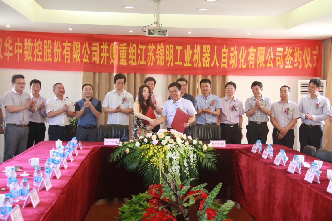 华中数控加码机器人业务,拟以发行股份和支付现金的方式收购江苏锦明工业机器人自动化有限公司100%的股权。双方已于近日签署并购框架协议,并购签约仪式上,华中数控陈吉红董事长、江苏锦明张英董事长、江阴市龚振东副市长分别发表讲话,公司叶建国副总裁、江阴市经信委王利峰主任、南闸街道缪慧书记、南闸街道李志浩主任等领导出席仪式。