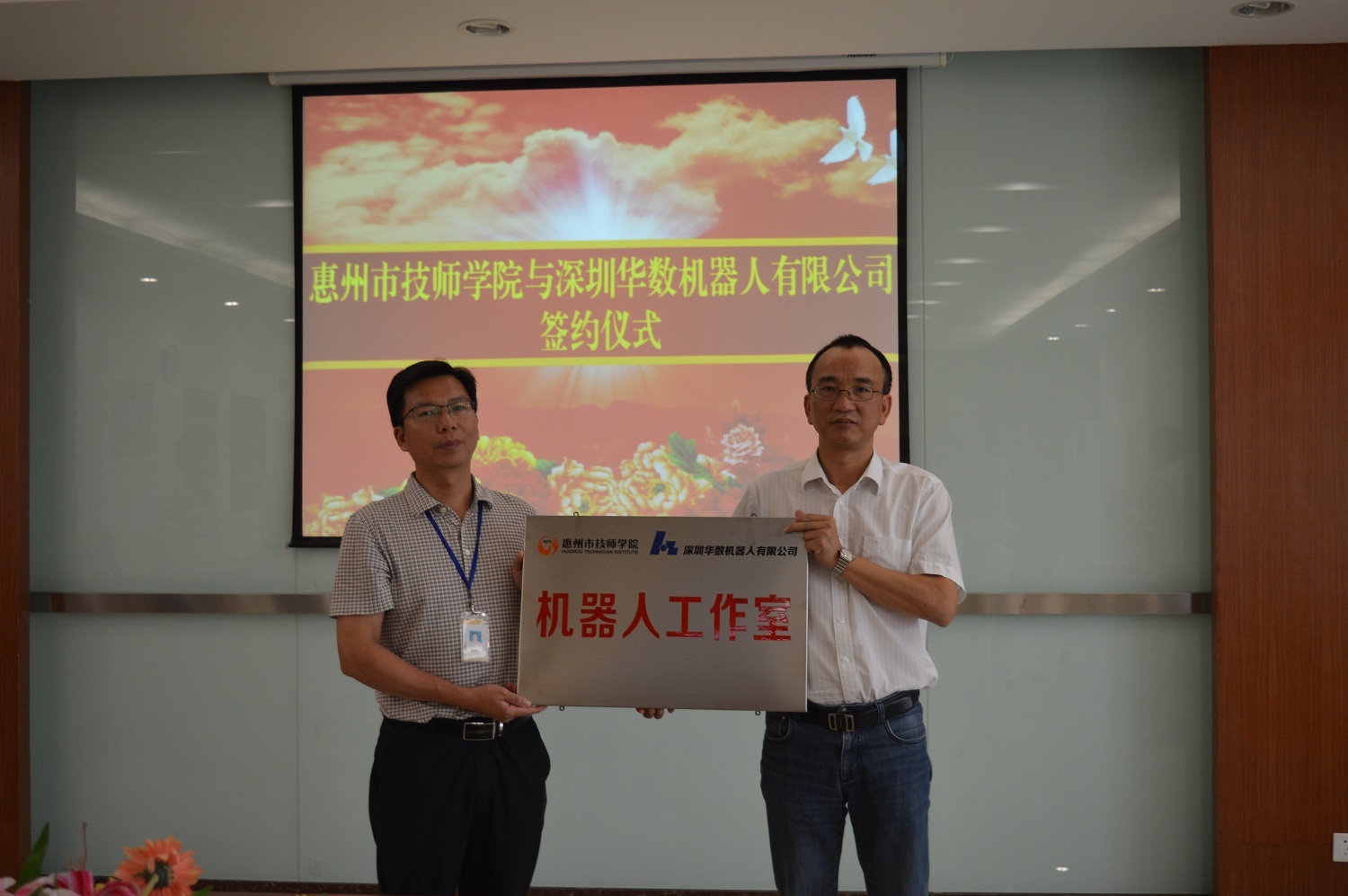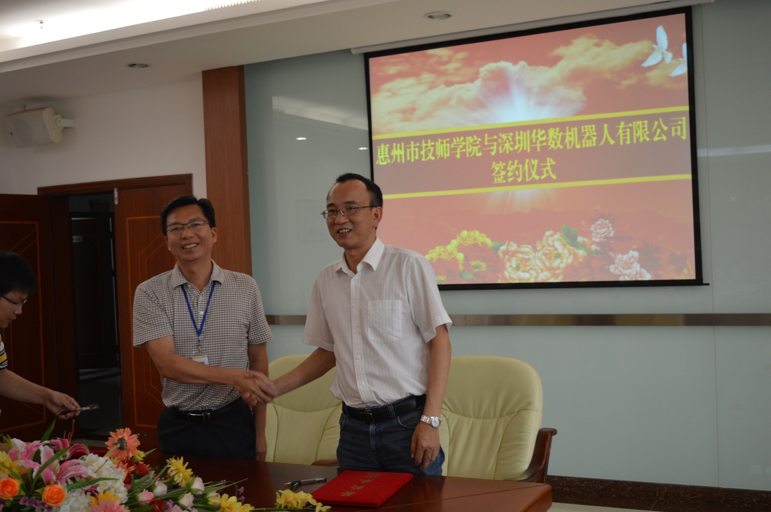 2016年6月7日,惠州市技师学院与深圳华数机器人签约仪式隆重举行。惠州市技师学院谭院长、分管校企合作黄院长、校企合作处朱处长、制造工程系邱主任、金主任出席签约仪式,武汉华中数控股份有限公司副总裁、深圳华数机器人有限公司总经理熊清平,副总经理杨志等出席本次签约仪式。