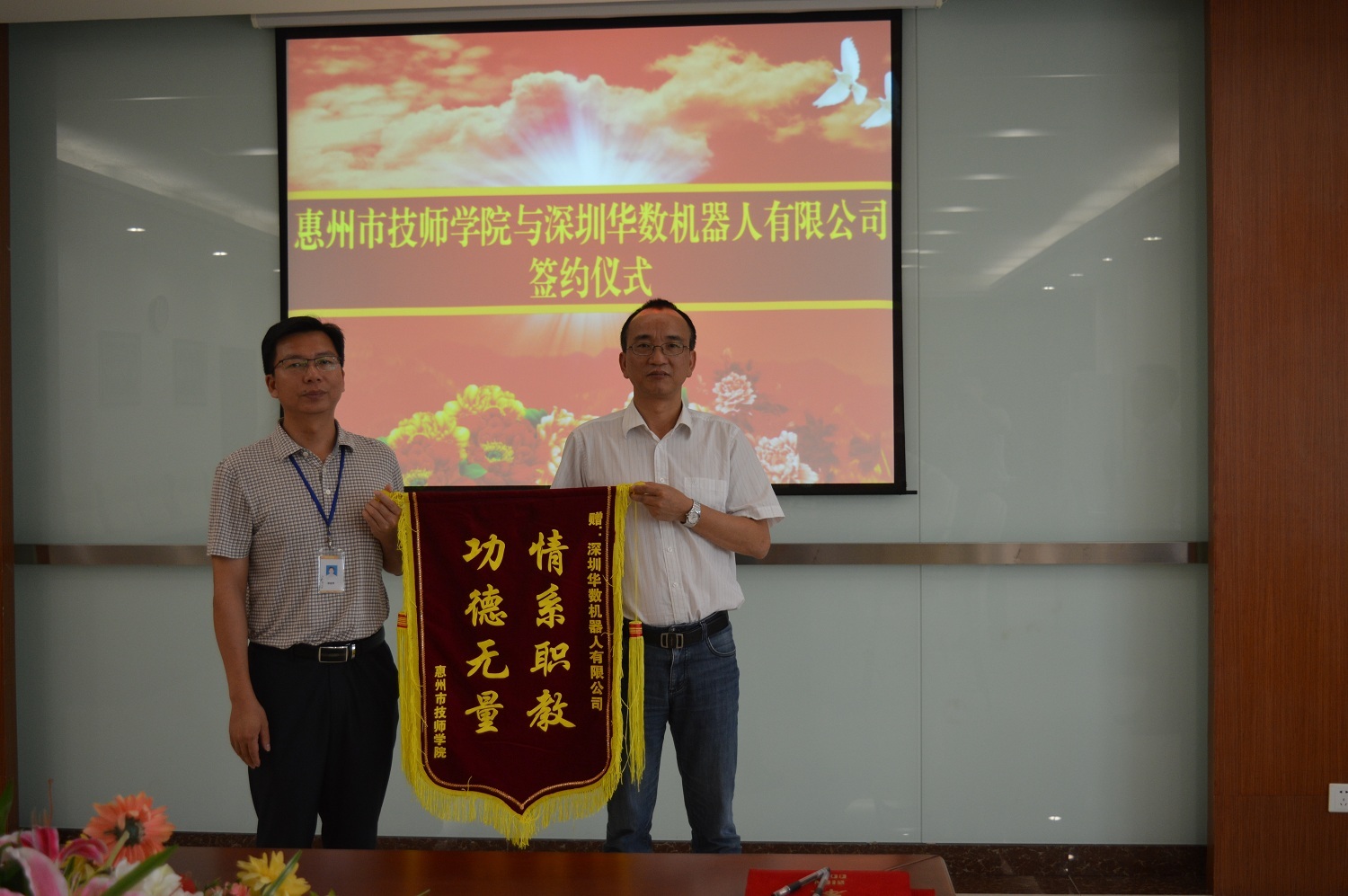 随后,双方进行签约仪式,惠州市技师学院聘请熊清平总经理为特聘专家,同时赠送华中数控“情系职教,功德无量”的锦旗。双方将共同在“机器人工作室”、“校企合作基地”、“人才培养中心”、“产学研基地”等方面将开展一系列合作。
