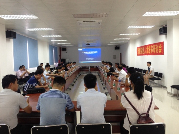 上午9时,与会代表一行参观了佛山市智能装备技术研究院,佛山华数机器人有限公司贺部长带领大家参观了机器人生产研发车间,介绍了华数机器人最新研发产品。然后,与会代表一起座谈,针对如何校企合作,建设智能制造示范基地,培养时代需要的智能制造人才进行研讨。