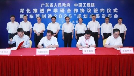 7月25日,广东省政府、中国工程院深化推进产学研合作协议签约仪式暨“东莞制造2025”规划成果发布会在东莞市举行。中国工程院院长周济、工业和信息化部部长苗圩、广东省省长朱小丹、工业和信息化部副部长辛国斌出席活动并见证协议签署。会上,东莞市政府梁维东市长、华中数控陈吉红董事长、东莞劲胜王建总裁、广东屯兴张辉斌总经理共同签署《东莞市智能制造试点示范应用推广合作框架协议》。