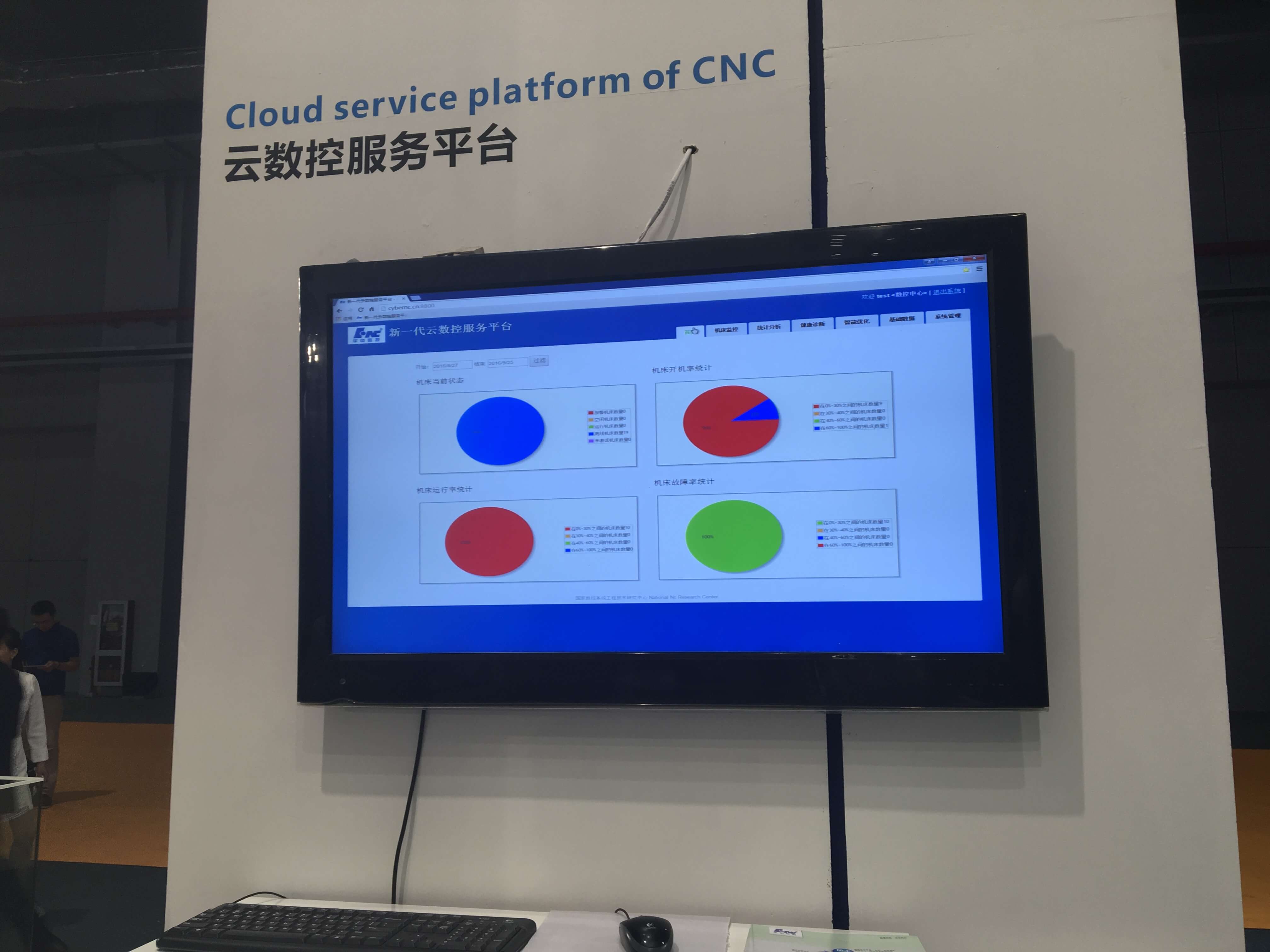 华中数控新一代云服务平台,是利用3G、WIFI等技术,通过无线网络,监控车间设备运行情况,通过对机床的不同状态的统计分析,对大数据的析挖掘,发现系统所存在的问题,以此为依据指导生产管理,展出取得了良好效果。