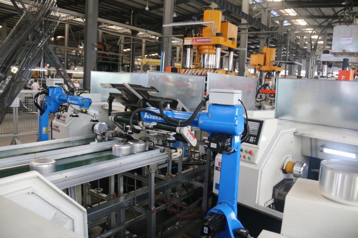 浙江三禾厨具是一家专业致力于中高端厨房用品的于科研、生产、销售与服务一体化的浙江省明星企业。公司现有职工1200余名,年生产能力达2400万只以上。拥有全自动的拉伸、喷涂、装配等生产线,具有雄厚的技术力量和精优的加工设备。三禾厨具从2016开始与宁波华数机器人开展合作,主要是使用华数机器人自动化生产线,代替人工进行锅具的打磨和上下料。