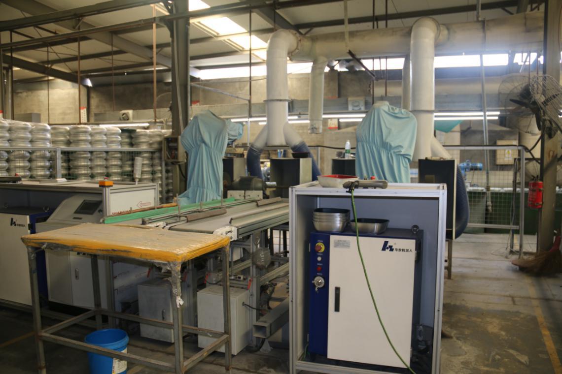 目前在三禾车间里的华数机器人自动化线有好多条,除了前面提到的蓝衣侠客(小蓝),还有小橙,小红。包括2台HSR612六轴机器人和2台HSR410四轴机器人组成的锅具拉伸生产线上下料;2台HSR620六轴机器人组成的锅具内壁打磨自动线;2台HSR612六轴机器人,1台HSR410四轴机器人和2台HSR606双旋机器人组成的锅底打磨自动化生产线;1台配置808xp的锅底车边生产线。