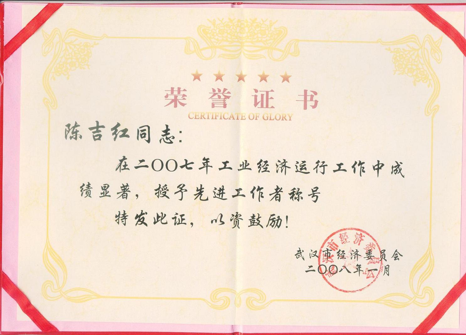 近日公司收到喜讯:公司获得武汉市二零零七年度工业经济运行先进企业;陈吉红二零零七年度工业经济运行先进工作者。
