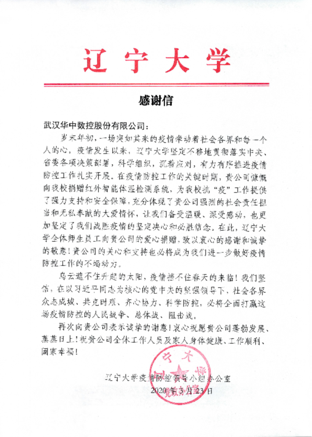 国务院点名表扬!国务院联防联控机制给华中数控发来感谢信