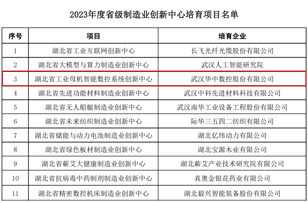 湖北新一批省级制造业创新中心培育名单公布,华中数控在列