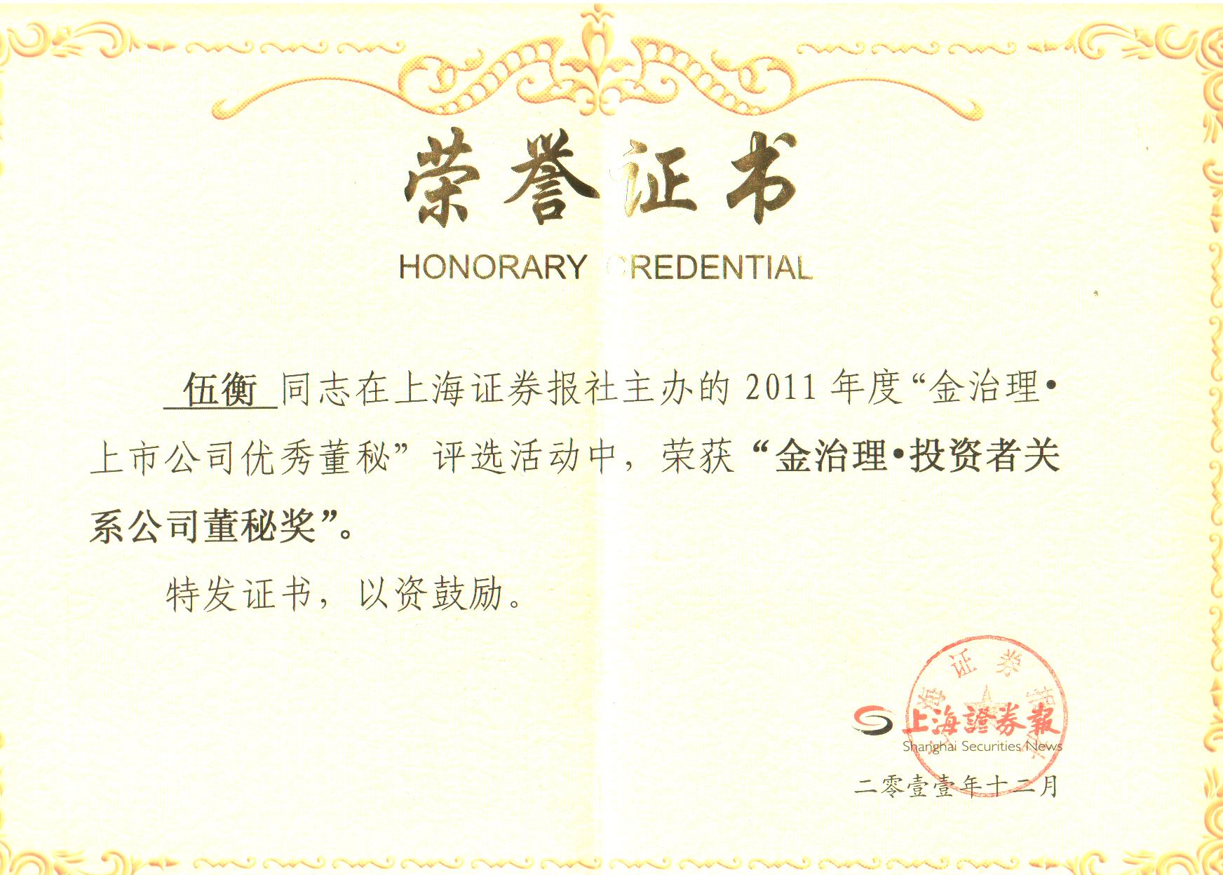 我公司董秘伍衡获上海证券报2011年度“金治理?投资者关系公司董秘奖”